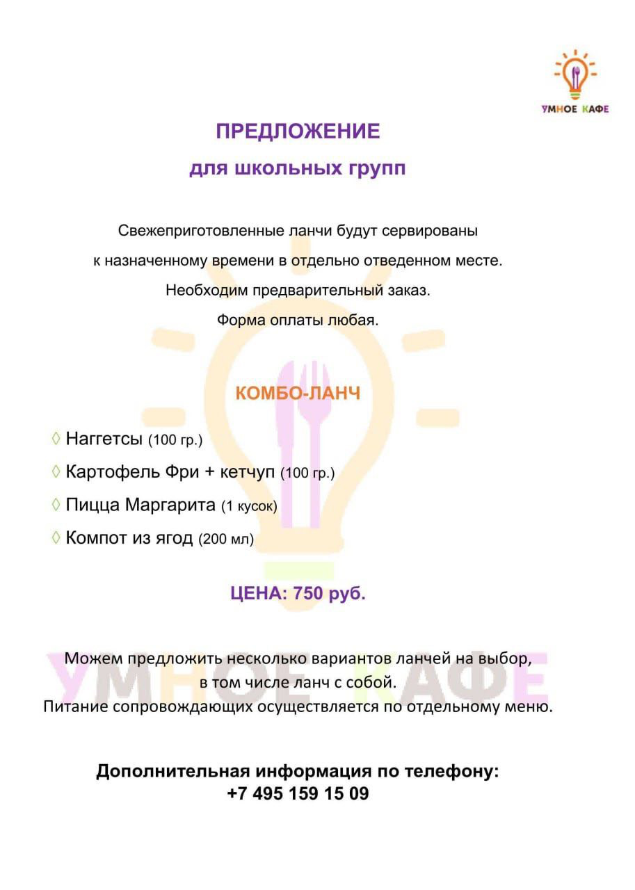 Здесь всегда можно выпить чашечку бодрящего кофе с ароматной выпечкой, забежать на легкий ланч или полноценно пообедать. Чтобы перекусить в «Умном кафе» совсем необязательно быть посетителем музея – здесь рады всем. Заказать еду из меню можно и навынос. Для организованных групп от десяти человек действуют специальные предложения.