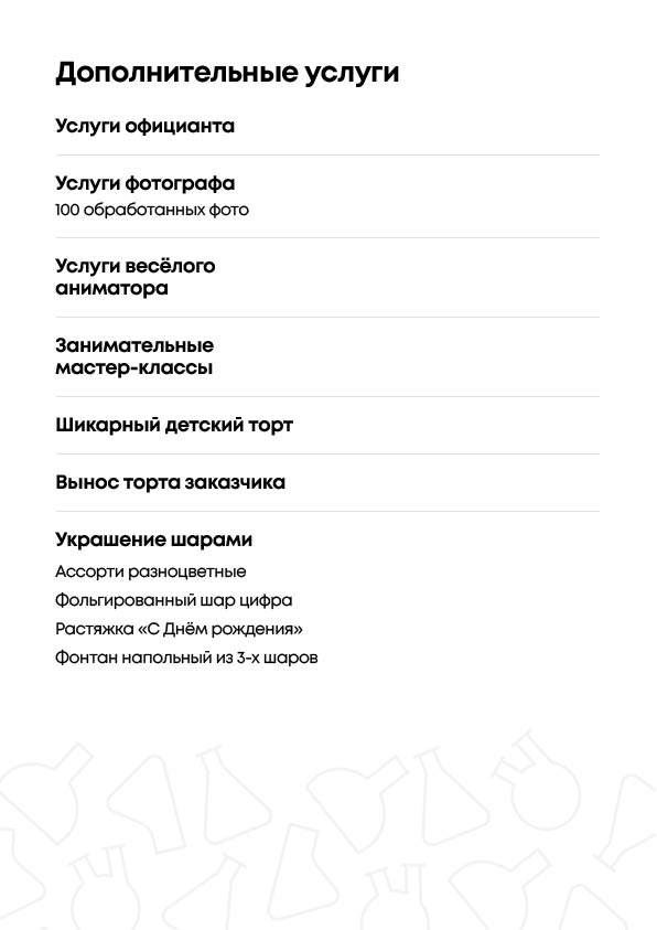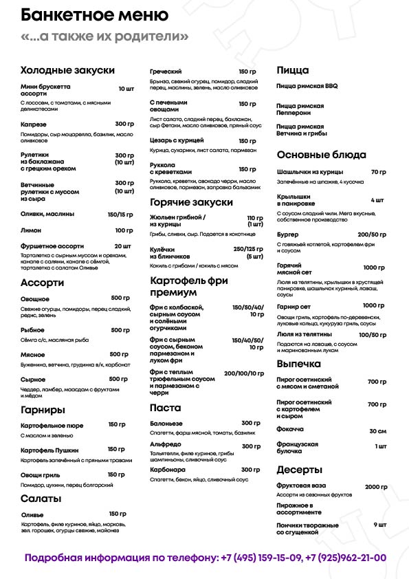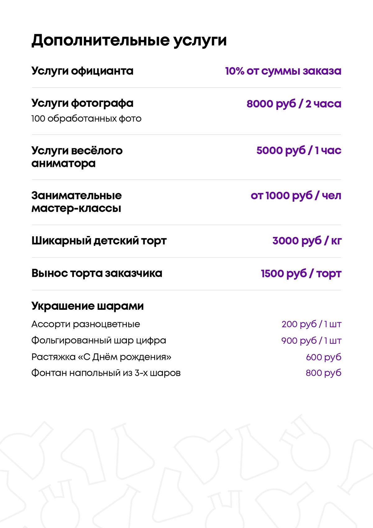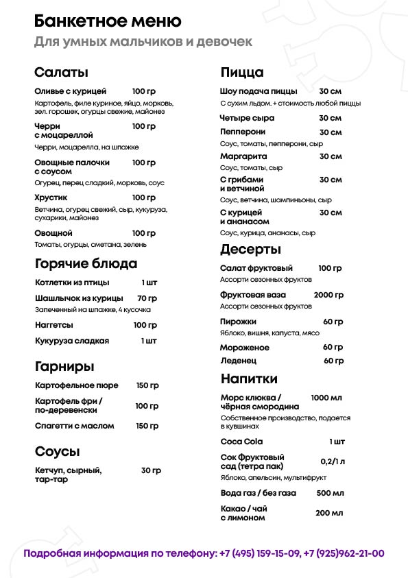Детское меню и тематическое оформление праздника отлично подойдет для праздничного обеда в кафе. Для взрослых гостей предусмотрено специальное праздничное меню, которое доступно при предварительном заказе.